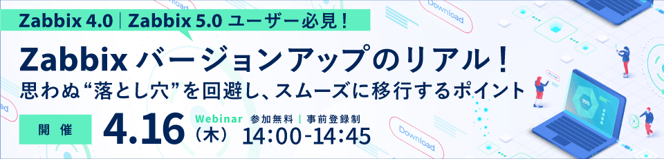 | 対象 | ・Zabbix 4.0、5.0を利用中で、バージョンアップの具体的な情報収集ができておらず検討が進んでいない方 ・推奨のバージョンアップ方法や事例、バージョンアップしない場合の影響などを知りたい方 |